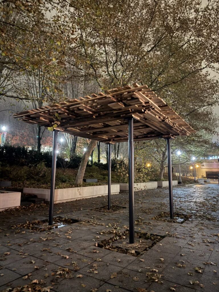 But the benefits, Yin and Henry agreed, are potentially scalable. To create the pavilion, titled “Re-SPLAM (Reclaimed Spatial Laminated Timber),” WashU and SOM forged a series of industry partnerships — with Rebuilding Exchange, Norcon Inc., the Mid-America Carpenters Regional Council and Simpson Strong-Tie, among others. The aim was to demonstrate how material reuse, combined with innovative structural design, can provide an economical, low-carbon alternative to conventional construction.