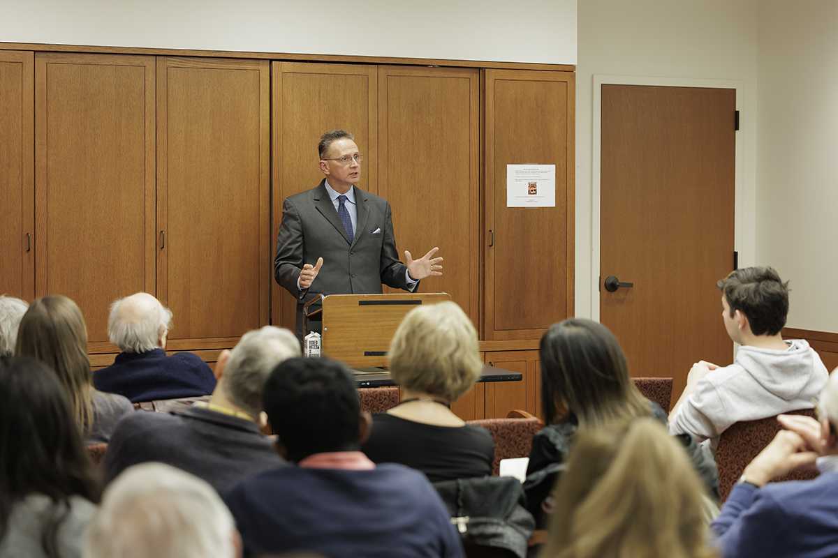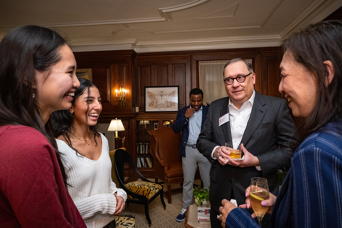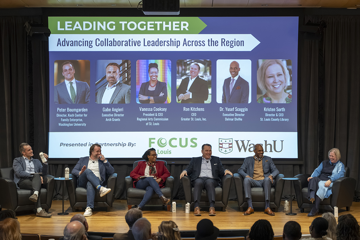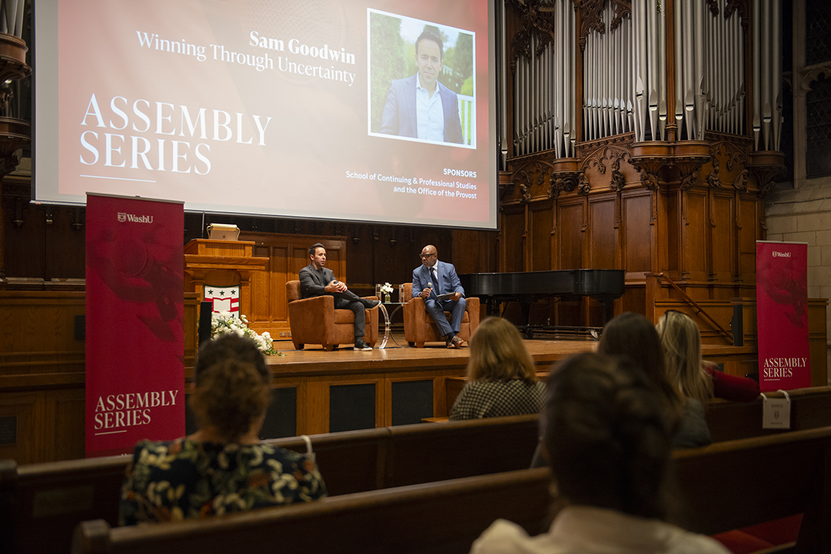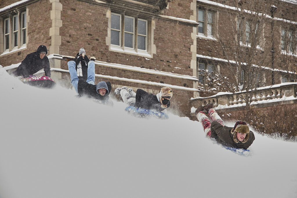 WashU alumnus Sam Goodwin (left) speaks with Continuing & Professional Studies Dean Sean Armstrong, as part of the Assembly Series Jan. 21 in Graham Chapel. (Photo: Kate Munsch/WashU)Amber Edmonds (left) and Eliana Hanna of the women’s tennis team mingle with Chancellor Andrew D. Martin and Vice Chancellor Anna Gonzalez during a dinner Jan. 22 at Harbison House to celebrate their first national championship. (Photo: Carol Green/WashU)Focus St. Louis hosts its “Leading Together” panel discussion Jan. 20 in Knight Hall’s Emerson Auditorium. (Photo: Dan Donovan/WashU)The Weidenbaum Center hosts a discussion Jan. 21 with Krister Knapp (center), a teaching professor of history in Arts & Sciences, on the unfolding situation in Venezuela and the Monroe Doctrine in Seigle Hall. Knapp explores how recent U.S. policy signals echo a 19th-century approach to foreign affairs — one that emphasizes American economic influence in the Western Hemisphere. (Photo: Rebecca K Clark/WashU)Students slide down campus hills on sleds and intertubes during a snowy winter day Jan. 25. (Photo: Zach Trabitz/WashU)Former U.S. Congressman Dick Gephardt (foreground, right) introduces Gephardt Institute Civic Fellows to Rep. Hakeem Jeffries of New York (foreground, left) during a winter break immersion trip in Washington D.C. Students also met Reps. Wesley Bell and Nancy Pelosi and the staff of Sen. Josh Hawley as well as WashU alumni who work in the national capital. (Photo courtesy of the Gephardt Institute)Sandro Galea, dean of the School of Public Health, joins the Gephardt Institute’s Civic Café to talk about public health Jan. 14 at Stix House. (Photo courtesy of the Gephardt Institute)Snow blankets campus Jan. 25 after a weekend winter storm. (Photo: Zach Trabitz/WashU)