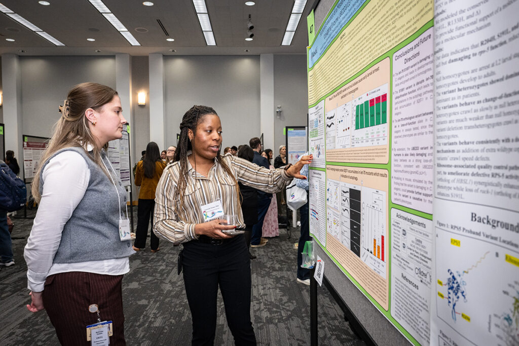 WashU Medicine researcher Gervette Penny (right) speaks with research technician McKinlee Gobble at the fourth annual Rare Disease Day Symposium Feb. 26 on the Medical Campus. The symposium this year attracted a record number of attendees and poster presentations. (Photo: Carol Green/WashU)
