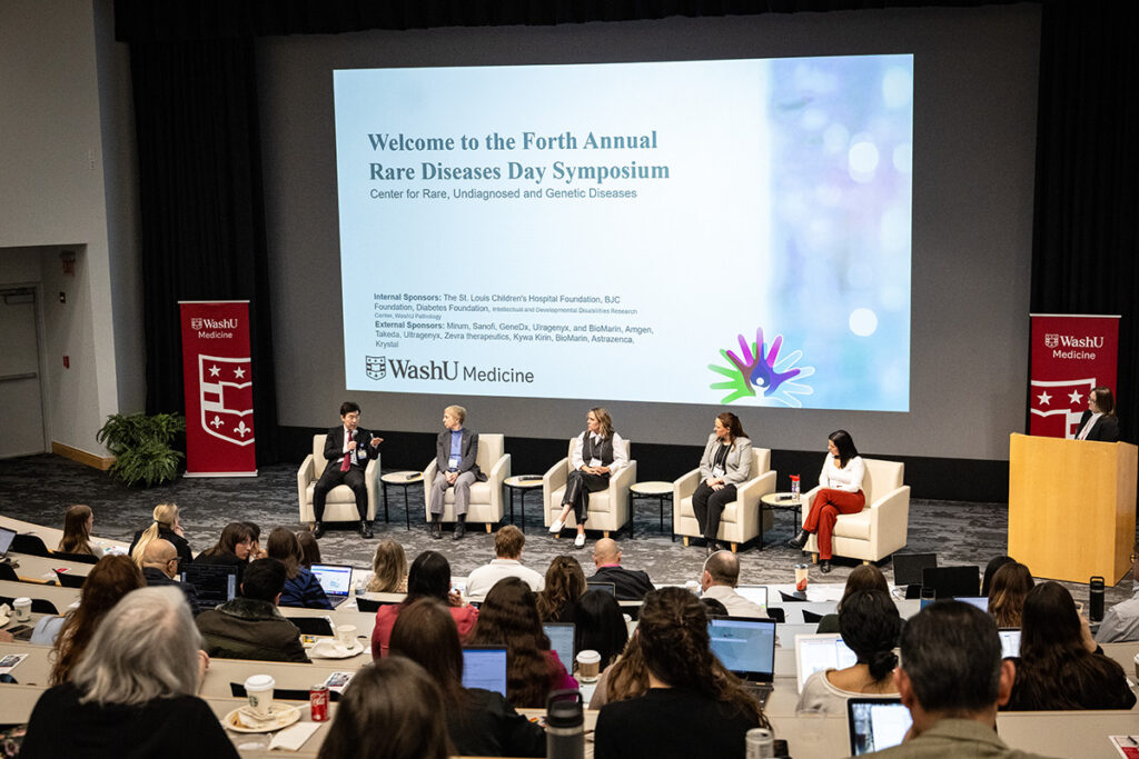 Keynote speakers at the fourth annual Rare Disease Day Symposium take questions from a packed auditorium Feb. 26 on the Medical Campus. They are (from left): Fumihiko Urano, MD, PhD, the Samuel E. Schechter Professor at WashU Medicine; Teri A. Manolio, MD, PhD, director of the Division of Genomic Medicine, National Human Genome Research Institute; Stephanie Snow Gebel, chairman and CEO of the Snow Foundation; Olivia Geritz, PharmD, program integrity pharmacist, MO HealthNet Division; and Christina SanInocencio, PhD, an assistant professor at Fairfield University. (Photo: Carol Green/WashU)