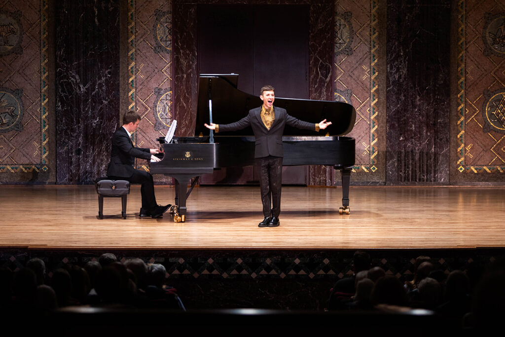 Acclaimed countertenor Anthony Roth Costanzo and pianist Bryan Wagorn present an intimate recital Feb. 22 in the E. Desmond Lee Concert Hall. Part of the Department of Music in Arts & Sciences’ spring Great Artists Series, the program included the music of Handel, Vivaldi, Liszt and Gershwin, among others. (Photo: Jamie Perkins/WashU)