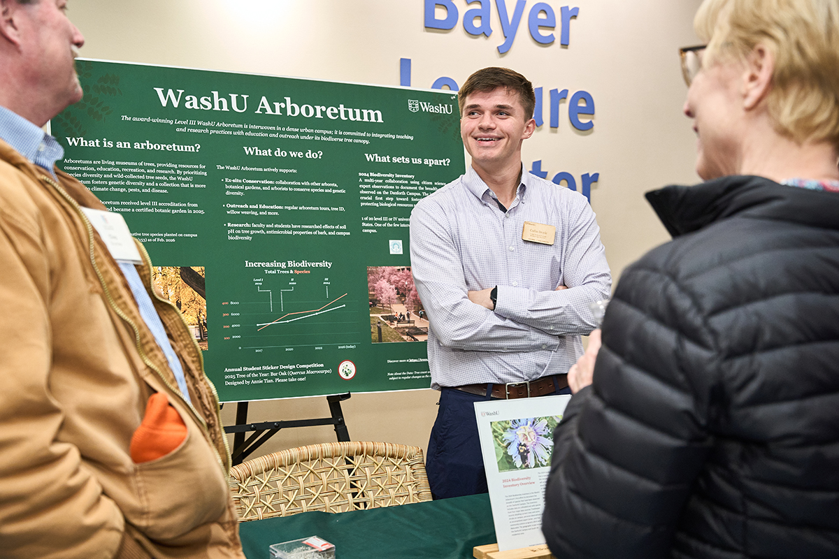 Colin Doyle, an Urban Trees & Ecology EnviroCorps member, speaks with guests at the Living Earth Collaborative’s “Hope in Action: Conservation Success Stories” event Feb. 26 at the Saint Louis Zoo. Guests mingled with representatives from regional conservation organizations and viewed informational displays during the networking reception. (Photo: Theo R. Welling/WashU)
