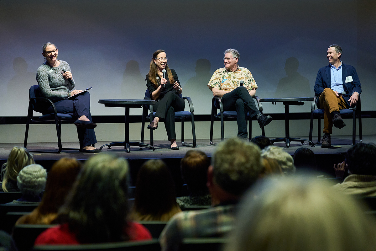 The Living Earth Collaborative hosts its “Hope in Action: Conservation Success Stories” event Feb. 26 at the Saint Louis Zoo. The event featured a panel discussion moderated by Emily Bowling (left), conservation education liaison at the Saint Louis Zoo, with Regina Mossotti, vice president of animal care at the zoo; Jonathan Losos, the William H. Danforth Distinguished University Professor in Arts & Sciences and director of the Living Earth Collaborative; and Matthew Albrecht, vice president of conservation and restoration and director of the center of conservation and sustainable development at the Missouri Botanical Garden. (Photo: Theo R. Welling/WashU)