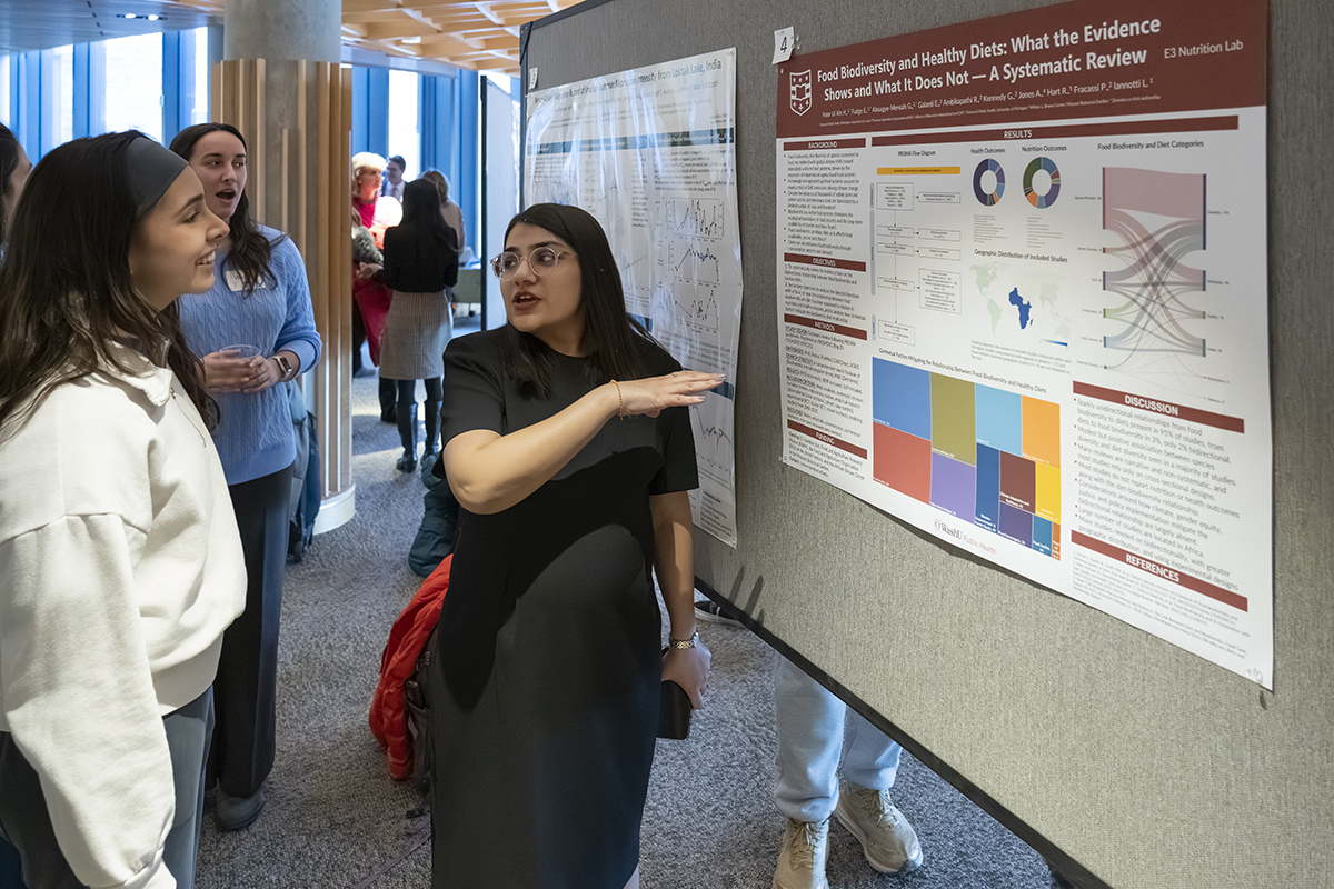 Attendees explore research at a poster session and networking reception during the Center for the Environment’s 2026 Environmental Research Symposium Feb. 23 in Hillman Hall’s Clark-Fox Forum. (Photo: Dan Donovan/WashU)