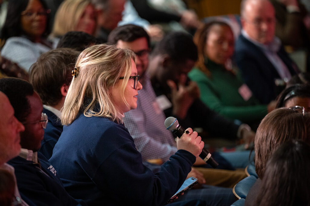 An audience member asks a question during Chancellor Andrew D. Martin’s 2026 State of the University Address March 2. (Photo: Sid Hastings/WashU)