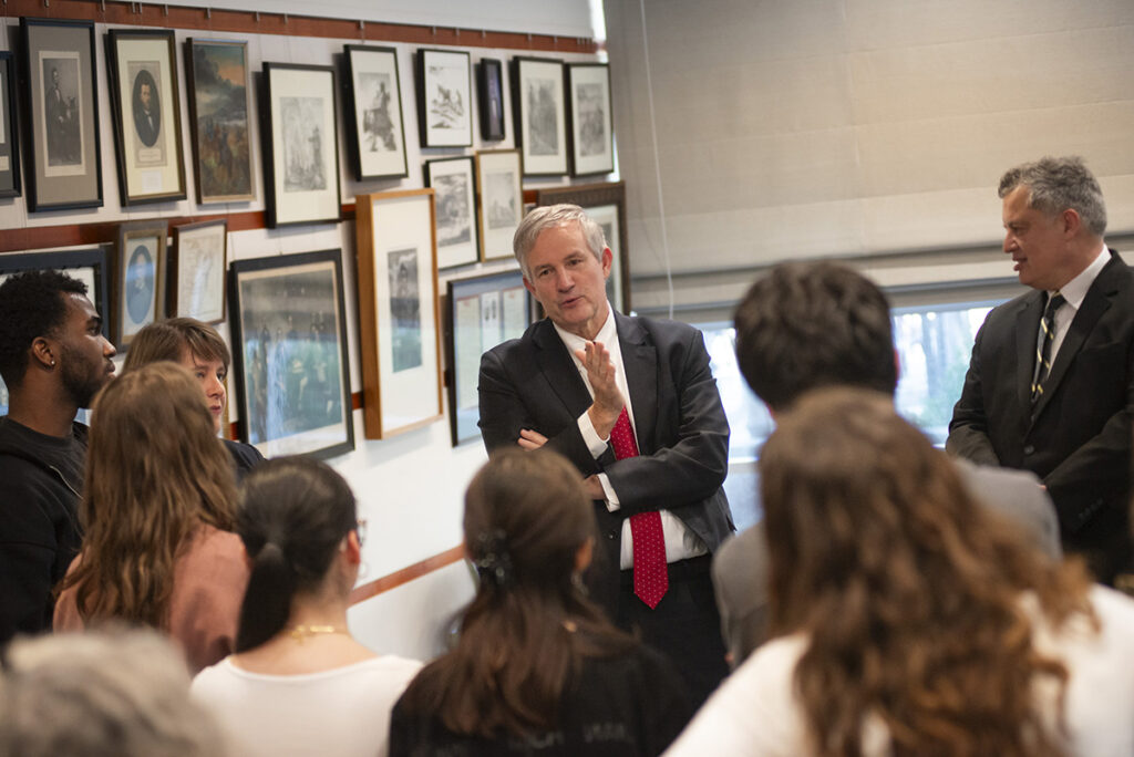 Laurent Bili, the French ambassador to the United States, visits Olin Library Feb. 26. The guided tour included a viewing of WashU’s original copy of the U.S. Declaration of Independence and a selection of French Enlightenment-era materials that shaped the revolutionary rights tradition. Afterward, Bili presented opening remarks for “The 1776–1789 Connection: Transatlantic Revolutions and the Birth of Human Rights,” a lecture and roundtable in the Clark-Fox Forum. Both events were organized by French Connexions, the cultural center directed by Lionel Cuillé (far right), a teaching professor of French in Arts & Sciences. (Photo: Kate Munsch/WashU)