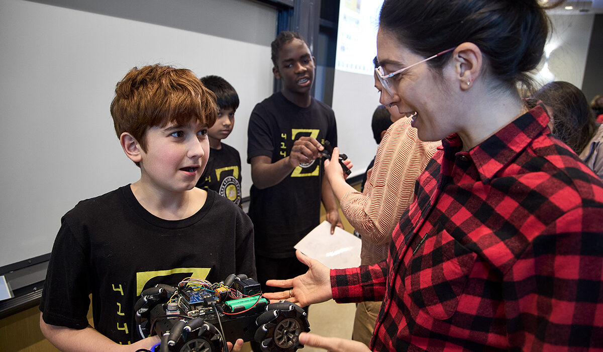 WashU archaeologist Ilaria Patania talks with seventh grader Laith Nawas about “Steve,” a robot built to explore caves. WashU faculty and students mentored dozens of students competing in the First Lego League robotics competition. (Photo: Zach Trabitz/WashU)