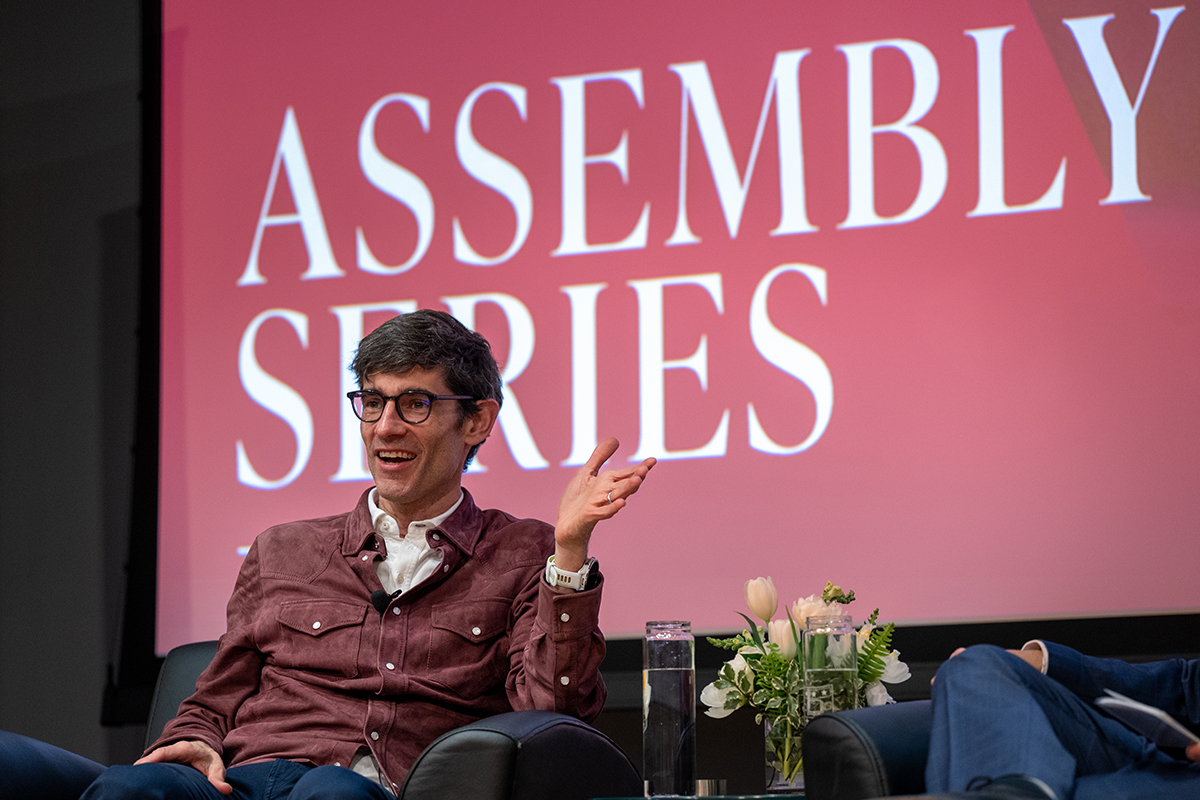 Nicholas Thompson, CEO of The Atlantic, answers questions after his Assembly Series lecture, ‘Graduates and AI: Who wins the future of work?,’ March 25 in Knight Hall. During his talk, Thompson explored the profound implications of AI for universities, employers and students alike. Drawing on his experience at the forefront of media, technology, and conversations with leaders across the tech C-suite, he unpacked how AI and big data are transforming business strategy, redefining talent pipelines and altering what employers truly value. The event was part of +AI Perspectives Week. (Photo: Sid Hastings/WashU)