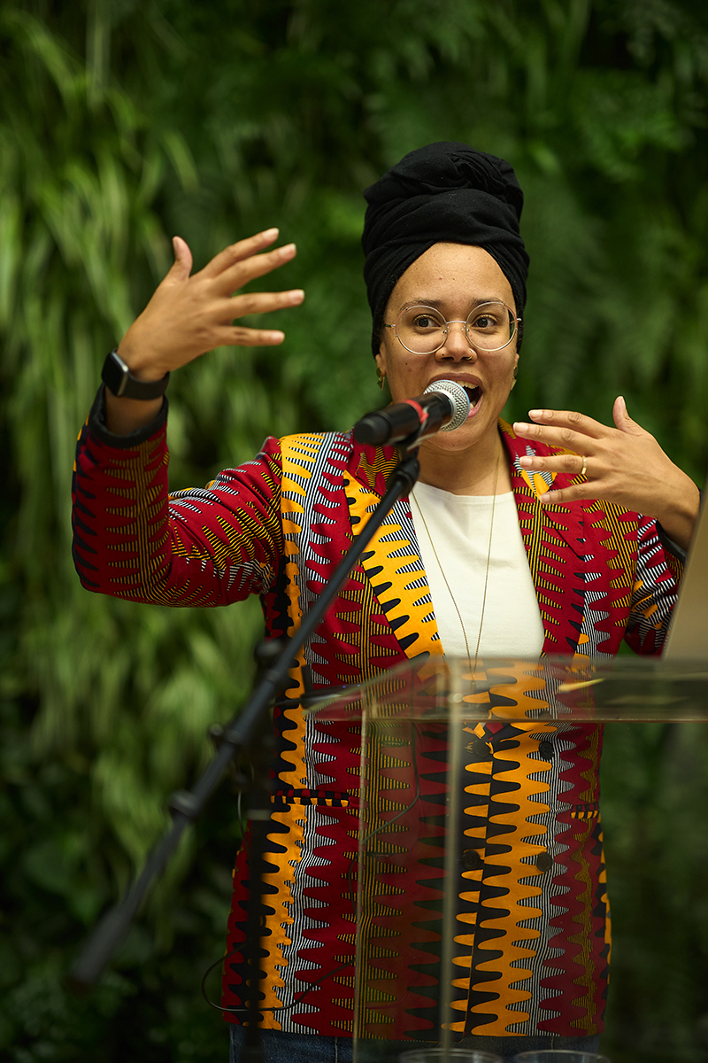 Jha D Amazi delivers the keynote address for the WashU Sam Fox School’s ‘Resilience as Resistance Symposium’ held March 19-20 in Weil Hall. Amazi, principal at MASS Design Group, leads their public memory and memorials lab and is a spoken word artist, event producer and space-maker for LGBTQ+ communities of color. Her design work includes projects such as the Emmett Till & Mamie Till-Mobley National Monument Project in Chicago, the Gun Violence Memorial Project, in mulitple cities, and the Sugar Land 95 Cemetery Revitalization Project in Texas. (Photo: Devon Hill/WashU)