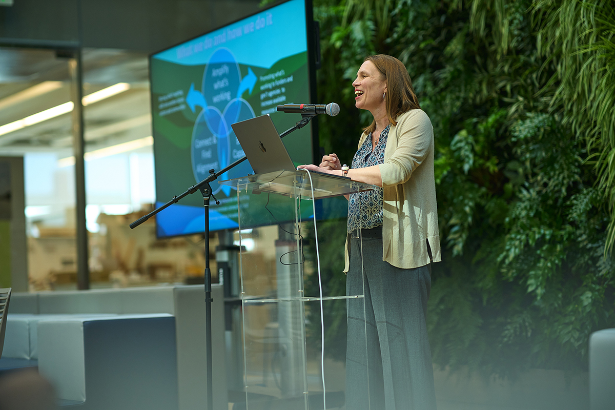 Heather Navarro, director of the Midwest Climate Collaborative, addresses attendees of the ‘Resilience as Resistance’ Symposium, held March 19-20 at Weil Hall. Breakout sessions explored urgent challenges of environmental resilience — from coastal adaptation to fire recovery — and social, cultural and historical resilience. (Photo: Devon Hill/WashU)