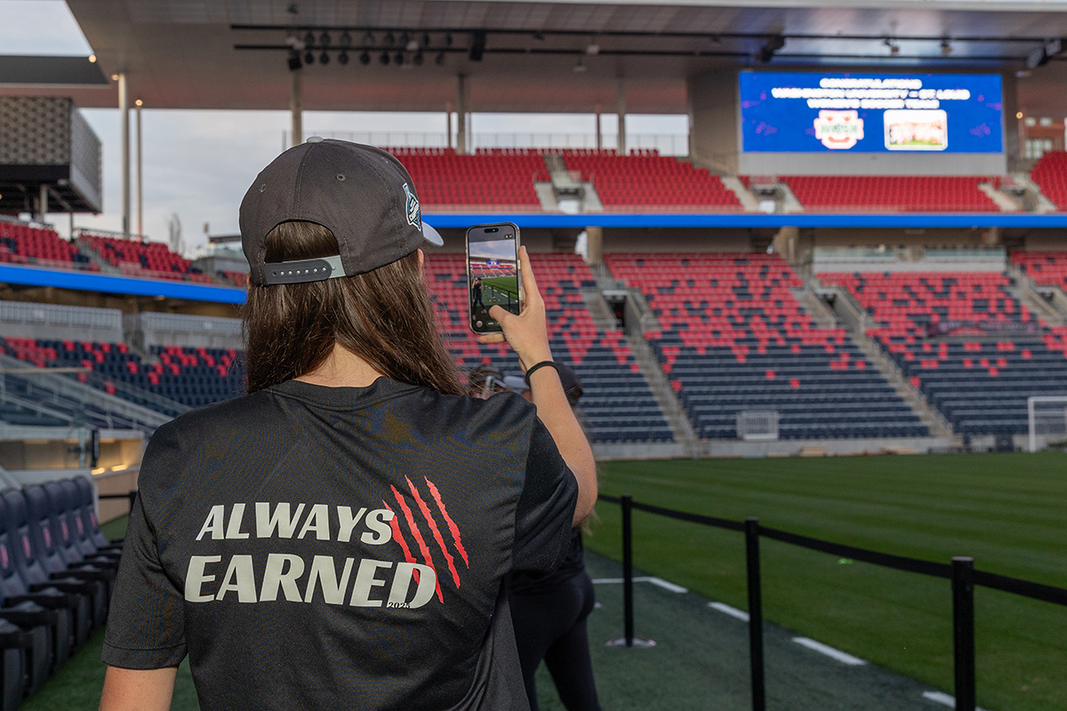 A WashU soccer player snaps a photo of the WashU Bears logo on the big screen at Energizer Park, the STL City soccer stadium in St. Louis. A March 30 event celebrated the women’s soccer team for their back-to-back championship-winning and undefeated seasons. (Photo: JJ Lane/WashU)