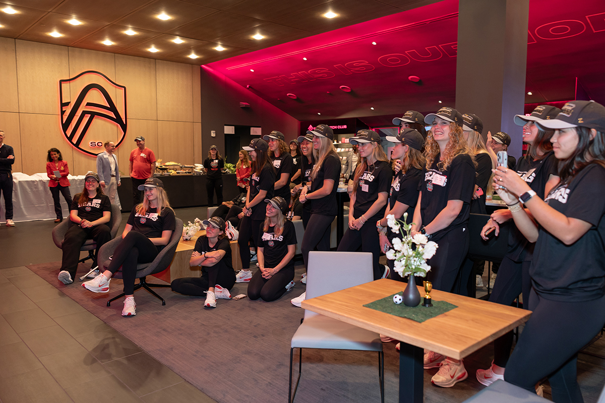 Members of the WashU women’s soccer team celebrate their back-to-back championship-winning and undefeated seasons at a special event held March 30 at Energizer Park, the STL City soccer stadium in St. Louis. (Photo: JJ Lane/WashU)