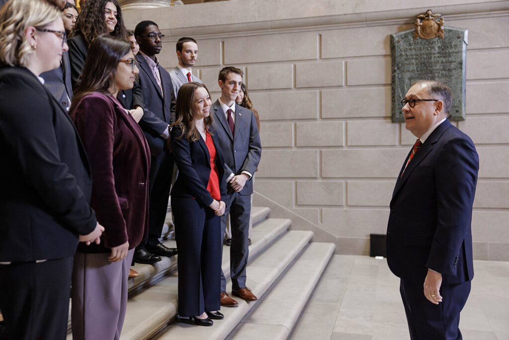 Chancellor Andrew D. Martin (right) speaks to Gephardt Institute for Civic and Community Engagement and Bear Caucus students before their meetings with state legislators March 24 as part of their efforts to advocate for WashU and higher education. (Photo: Whitney Curtis/WashU)
