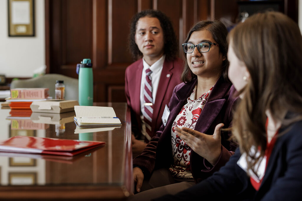 Undergraduate Bear Caucus members Bralin Duckett (left), Tanya Keskar and Elena Wierich meet with Missouri Sen. Jason Bean in his office. Students and representatives from the Gephardt Institute, the Bear Caucus, the Office of Government & Community Relations and WashU leaders met with legislators and state officials at the Missouri State Capitol to advocate for WashU and higher education. (Photo: Whitney Curtis/WashU)