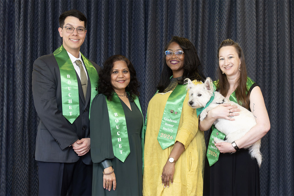 Kevin Hurtado (left), Pallavi Chhabra, Jessica S. Samuel and Elizabeth J. Carlen, joined by her dog, Finn, were inducted into the Bouchet Graduate Honor Society April 15 at the Women’s Building. The society recognizes outstanding scholarly achievement and promotes excellence in doctoral education and the professoriate. (Photo: Chantel Sutberry/WashU)