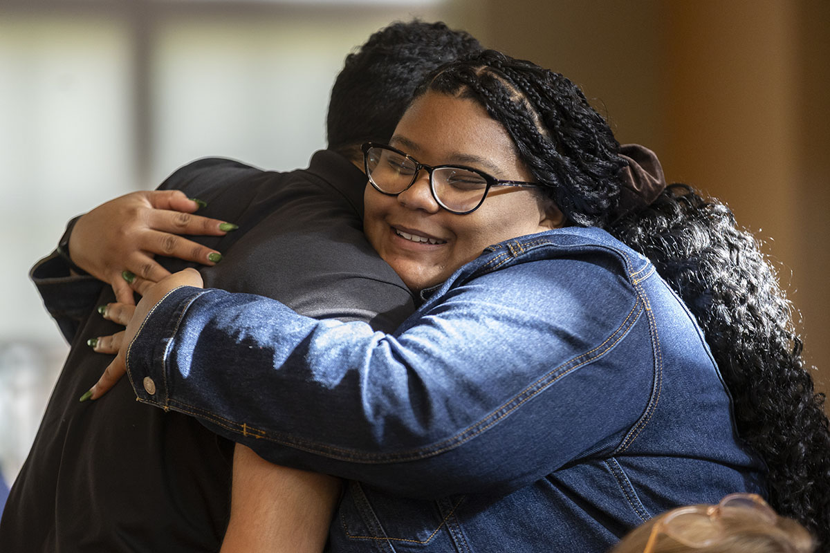 Joyful attendees embrace at the Annual Excellence in Leadership Awards, held April 16 at Risa Commons on the South 40. Through these awards, Campus Life honors student leaders and groups who actively pursue and demonstrate excellence in leadership within the campus community. (Photo: Jerry Naunheim Jr./WashU)