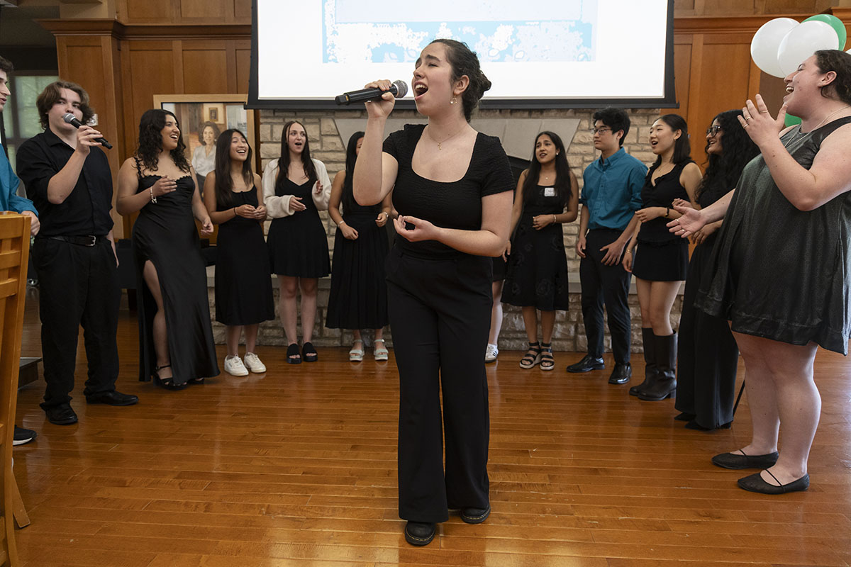 An a cappella singer serenades the crowd at the Annual Excellence in Leadership Awards, where Campus Life honors student leaders and student groups. (Photo: Jerry Naunheim Jr./WashU)