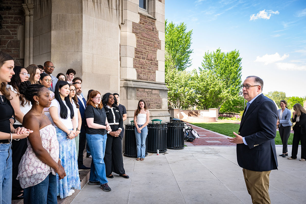 Chancellor Andrew D. Martin (right) speaks to Philanthropy Lab students April 16 in Brookings Quadrangle. The class, which has just completed its sixth year, has awarded more than $600,000 to local nonprofits. (Photo: Carol Green/WashU)