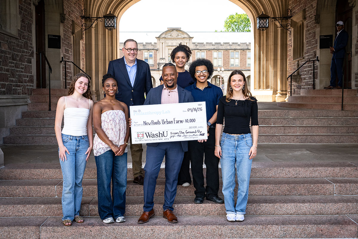 Philanthropy Lab students awarded $10,000 to New Roots Urban Farm, which serves north St. Louis communities. Before awarding grants, students conducted site visits and reviewed funding proposals. In total, the 2026 class awarded $120,000 in grants. (Photo: Carol Green/WashU)
