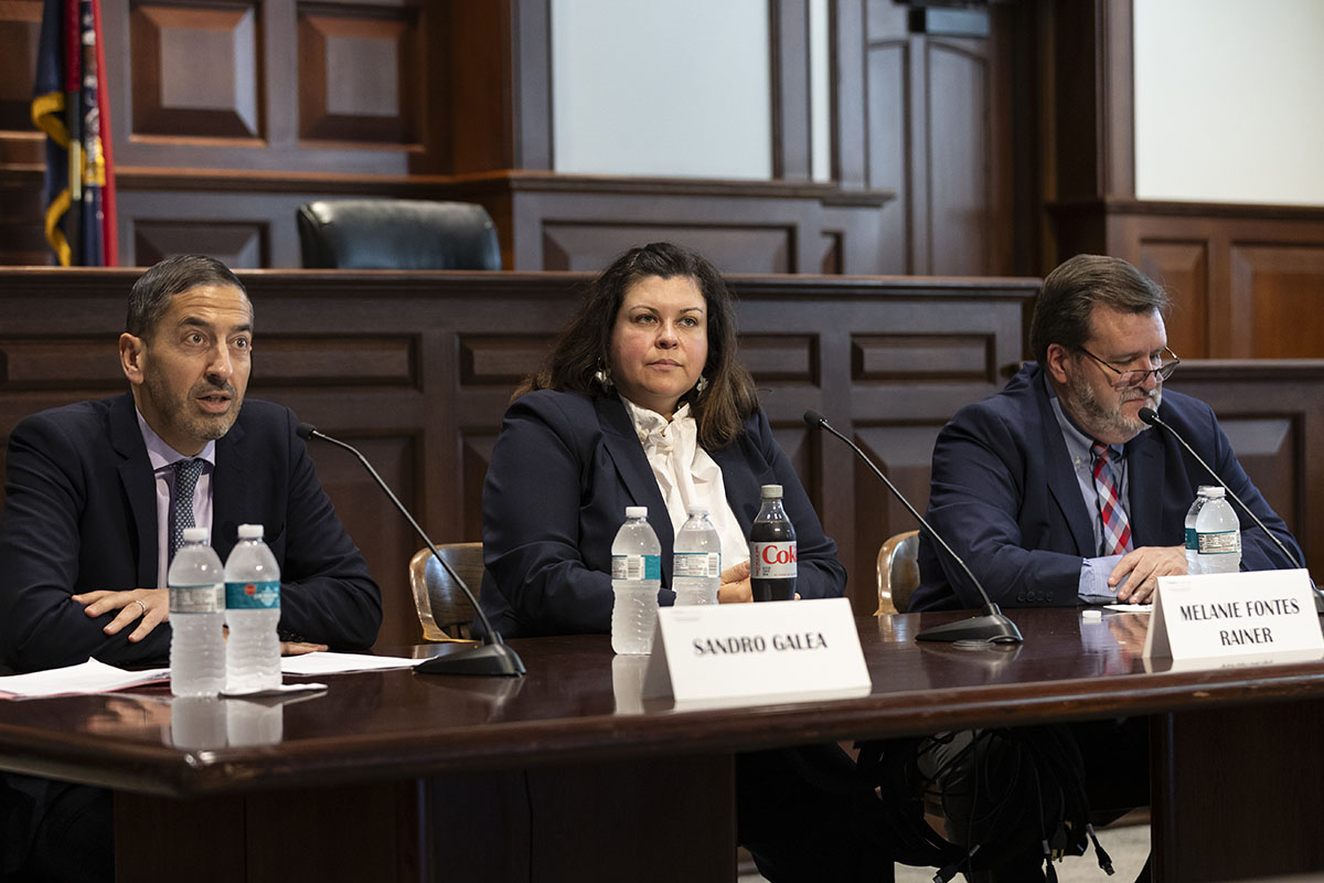 The Weidenbaum Center hosts a bipartisan panel discussion on the future of U.S. health care, “Health Care at the Crossroads,” April 17 in Anheuser-Busch Hall. Panelists included WashU’s Sandro Galea (left), dean of WashU Public Health; Melanie Fontes Rainer, former director of the Office for Civil Rights at the U.S. Department of Health and Human Services; and Timothy D. McBride, a professor at WashU Public Health. (Photo: Jerry Naunheim Jr./WashU)