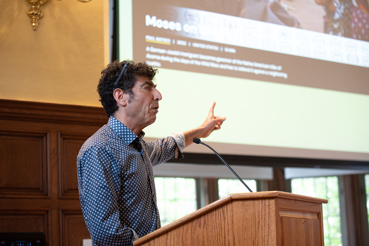 Michael Hoberman, author of the book, “Imagining Early American Jews,” speaks at an April 13 public lecture at Umrath Hall, hosted by the Danforth Center on Religion and Politics. Hoberman described how the Jewish experiences of the American Revolution, slaveholding in the early republic and antebellum period and westward migration have been imagined, commemorated and frequently mythologized. (Photo: Max Bouvatte/WashU)