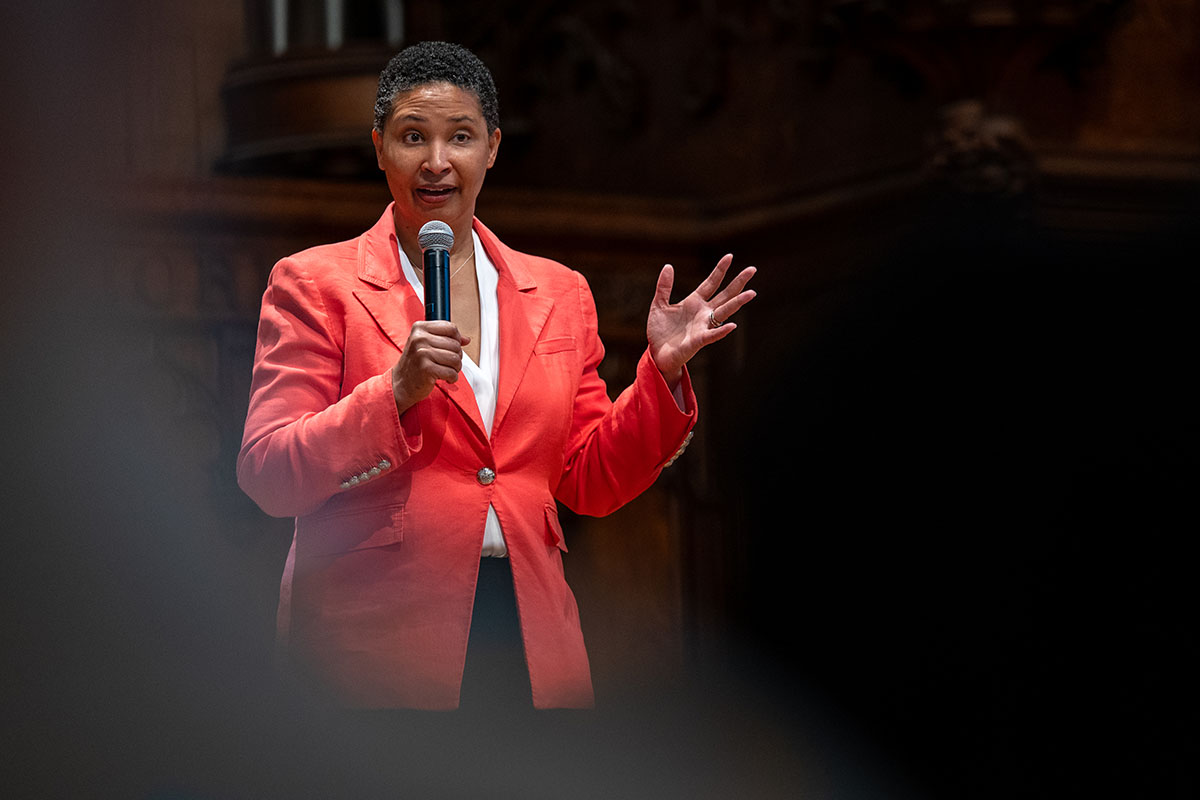 The John C. Danforth Center on Religion and Politics at WashU hosts political philosopher and democracy advocate Danielle Allen for the public lecture “The Declaration of Independence Today: Why an Old Text Still Serves Us Now,” April 16 in Graham Chapel. Allen, of Harvard University, came to WashU in conjunction with a special course “1776: Then and Now” offered this spring to commemorate 250 years since the country’s founding. (Photo: Sid Hastings/WashU)