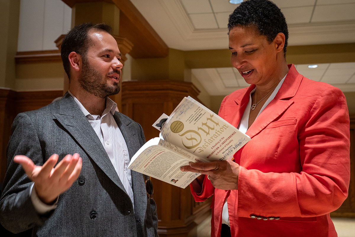 Harvard University’s Danielle Allen signs a copy of her book for Otto Brown (left), civic engagement manager at the WashU Gephardt Institute for Civic and Community Engagement. She earlier had given a public lecture, “The Declaration of Independence Today: Why an Old Text Still Serves Us Now.” (Photo: Sid Hastings/WashU)