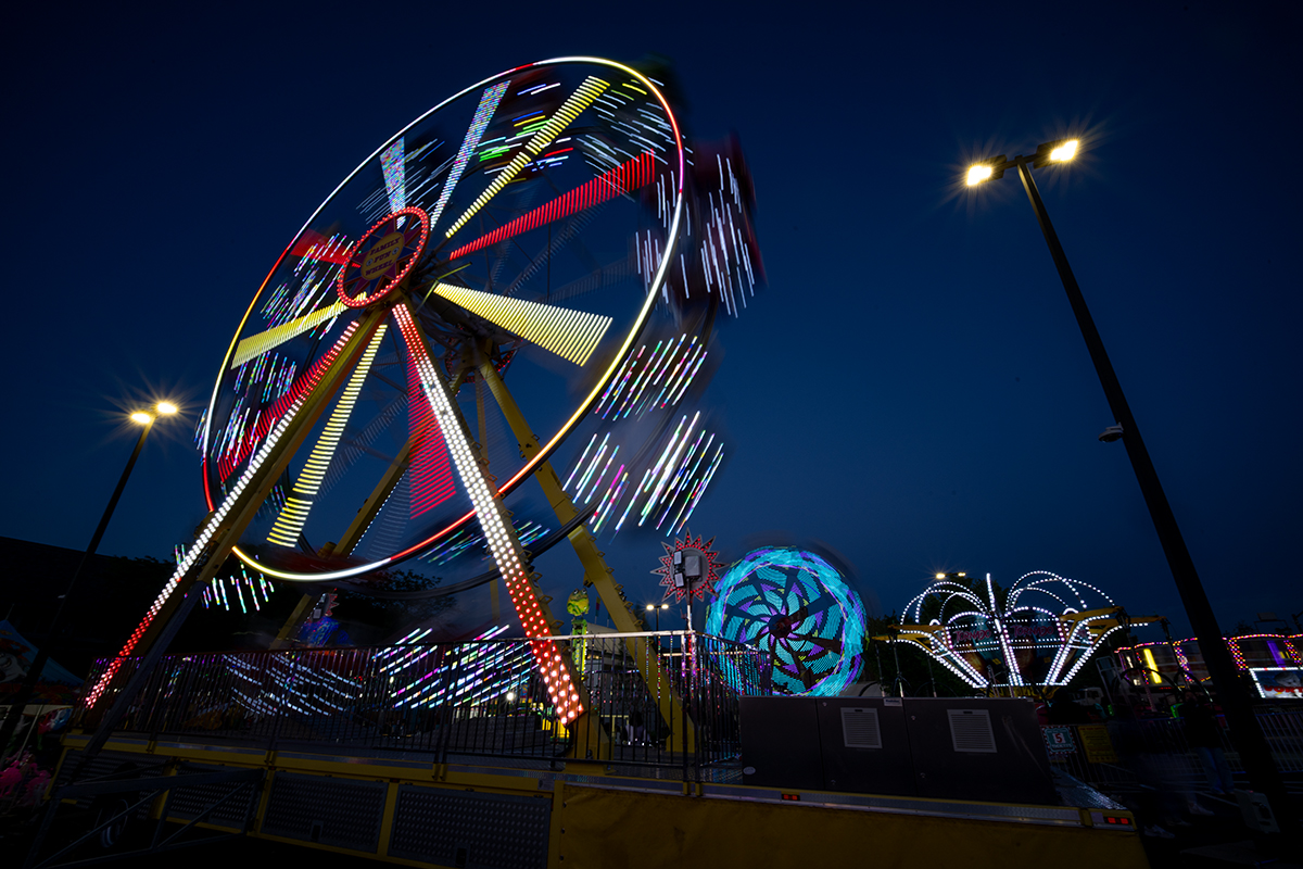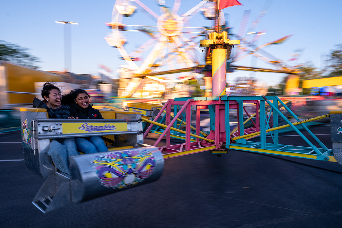 Two students enjoy a ride on the scrambler at Thurtene Carnival and WashU Community Night April 18. Located on the west end of the Danforth Campus, Thurtene and its earlier iterations have been a beloved tradition for more than a century. Thurtene is staged by the 13 members of the Thurtene junior honorary. (Photo: Jeff Curry/WashU)
