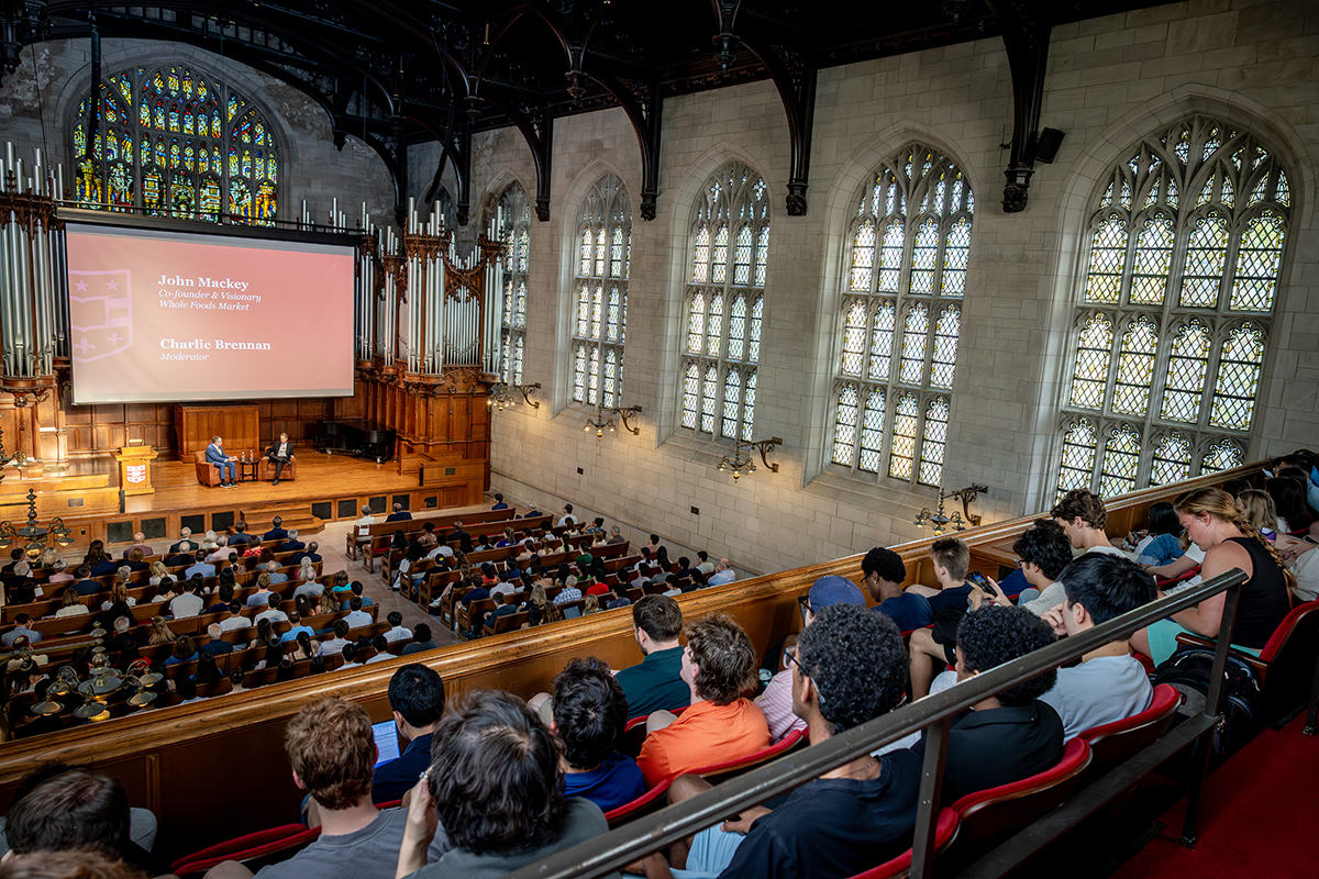 John Mackey, co-founder of Whole Foods Market, delivers the keynote address for WashU Olin Business’ annual Brauer Lecture Series April 14 in Graham Chapel. In Mackey’s 44 years as CEO, the natural and organic grocer grew from a single store in Austin, Texas, to 540 stores in the U.S., U.K. and Canada, with annual sales exceeding $22 billion and more than 105,000 employees. (Photo: Sarah Carmody/WashU)