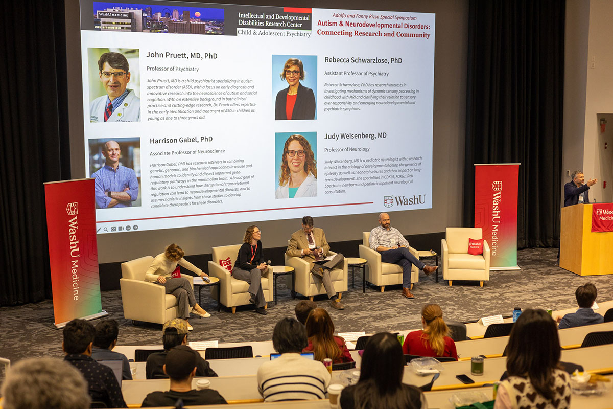 WashU Medicine scientists Harrison Gabel, PhD; John Pruett, MD, PhD; Judy Weisenberg, MD; and Rebecca Schwarzlose, PhD, presented their latest research on autism at the Rizzo Special Symposium, held at the Eric P. Newman Education Center on the Medical Campus April 8. Co-hosted by the Intellectual and Developmental Disabilities Research Center and Division of Child Psychiatry at WashU Medicine, the event highlighted cutting-edge research alongside lived experiences to foster a more comprehensive understanding of autism and its care. (Photo: Eliza Gan/WashU)