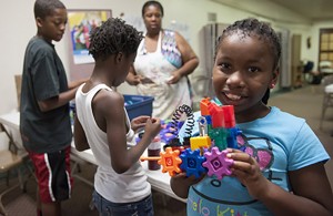 The inaugural Health and Engineeering Careers Summer Camp took place in late July at West Side Missionary Baptist Church in St. Louis. Numerous Washington University in St. Louis groups co-sponsored the event, which aimed to encourage underrepresented children to focus on science and math subjects. Here, 10-year-old Deja Stallworth proudly shows off the robot she made.